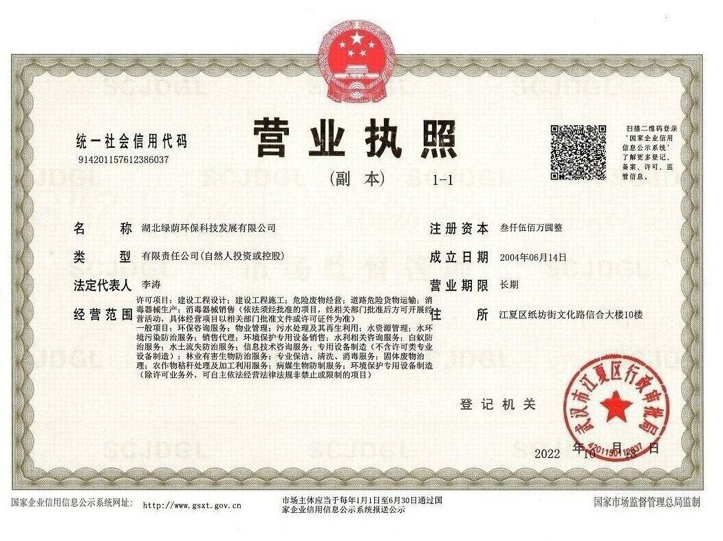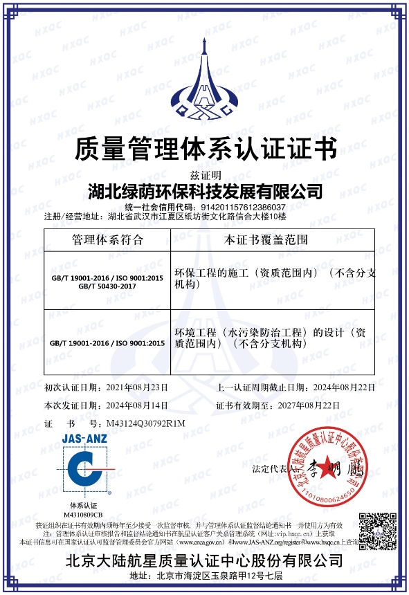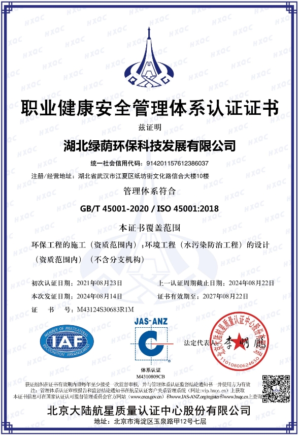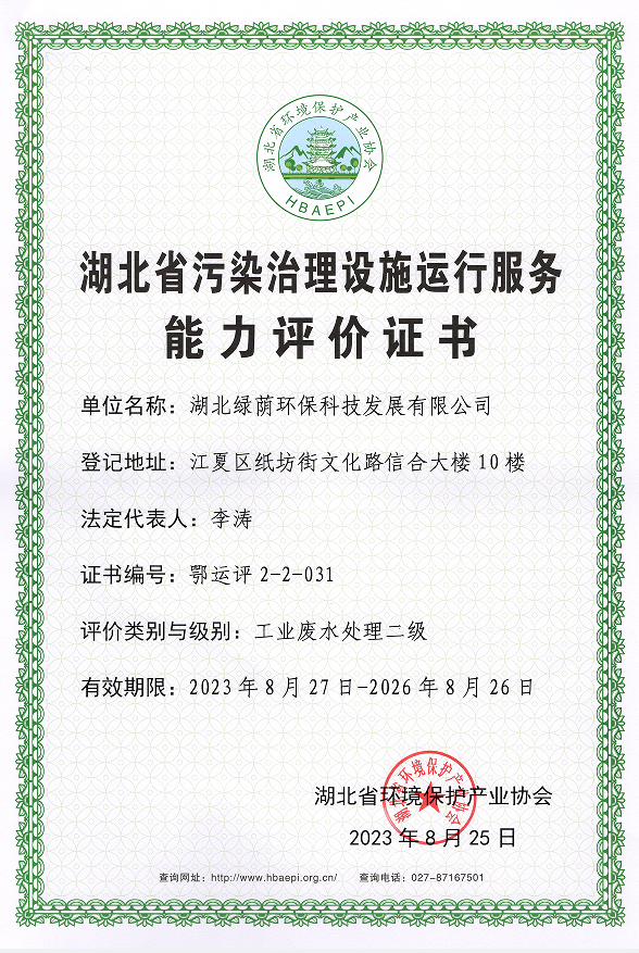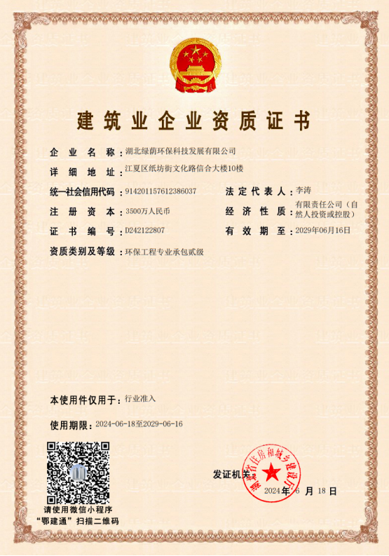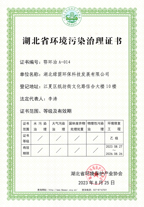 營業(yè)執(zhí)照 開戶許可證 安全生產(chǎn)許可證 工程設計資質(zhì)證書 建筑業(yè)企業(yè)資質(zhì)證書 產(chǎn)業(yè)協(xié)會會員證 湖北省環(huán)境污染治理證書(環(huán)境修復工程乙級) 污染治理設施運行服務能力評價證書(生活污水處理二級) 污染治理設施運行服務能力評價證書(工業(yè)廢水處理二級) 質(zhì)量管理體系認證證書 職業(yè)健康安全管理體系認證證書 環(huán)境管理體系認證證書 AAA企業(yè)信用等級證書 湖北省專精特新中小企業(yè)